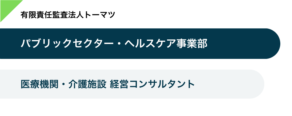 - 当法人のパブリックセクター・ヘルスケア事業部は、「プロフェッショナルとしての矜持を持ち、社会課題の解決等を通じてパブリックガバナンスの発展に貢献する」ことをミッションとし、公的機関及び非営利組織に伴走するパートナーとして、日本国内の医療介護施設や地域が抱える医療介護分野の社会課題を解決するためのプロジェクトを推進しています