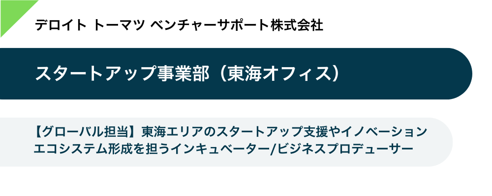 デロイトトーマツベンチャーサポート株式会社 【グローバル担当】東海エリアのスタートアップ支援やイノベーションエコシステム形成を担うインキュベーター/ビジネスプロデューサー